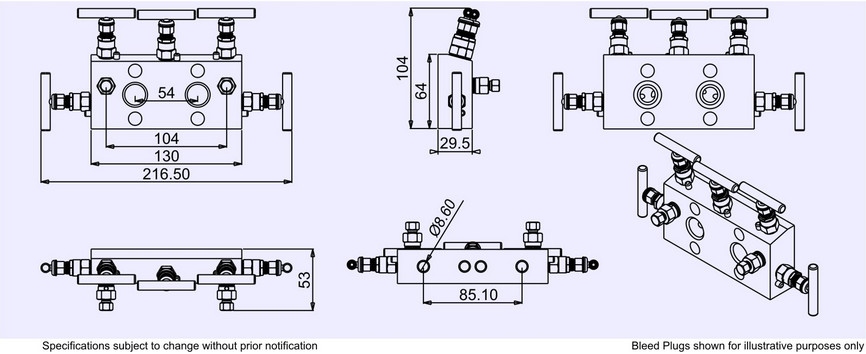 The L5/B manifold mounts directly to standard differential pressure transmitters. This body style places most of the taps on top of the manifold. The wide body design allows for 54mm centers on the impulse lines, matching standard transmitter centers. The manifold is supplied with the transmitter seals as standard, with the bolting kit being included as and option added to the part number. |