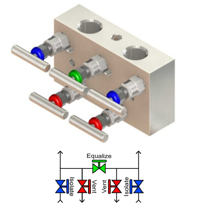 The L5/G manifold mounts remotely from differential pressure transmitters, gauges or switches. The "all taps on top" design allows this manifold to be panel mounted for a clean system look. |