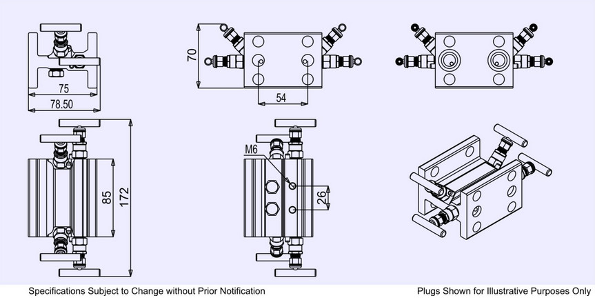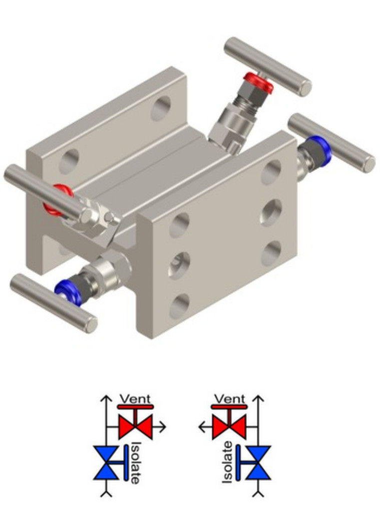 The L2/HKL manifold mounts directly to standard pressure transmitters. Designed for liquid level applications with two isolation valves operationg in parallel to shut off either one of the two process lines through the manifold. No equalizer passage run through the manifold, effectively seperating the two process lines. Venting of process media can be safley done, after isolation of process media, via the vent port. The manifold is supplied with the transmitter seals as standard, with the bolting kit being included as and option added to the part number. |