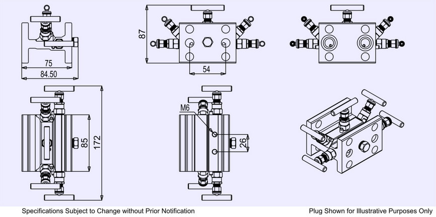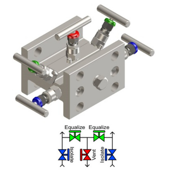 The L5/HKD manifold mounts directly to standard differential pressure transmitters. Utilizing a double equalize pattern, greater accuracy can be ensured while calibrating. Equalize valves integrities can be established while trnasmitter is in use by venting between the two equalize valves. Great cost benefits can be achieved due to the light weight design, such as reducing shipping costs. The manifold is supplied with the transmitter seals as standard, with the bolting kit being included as and option added to the part number. |
